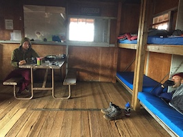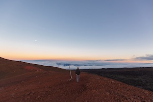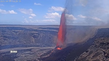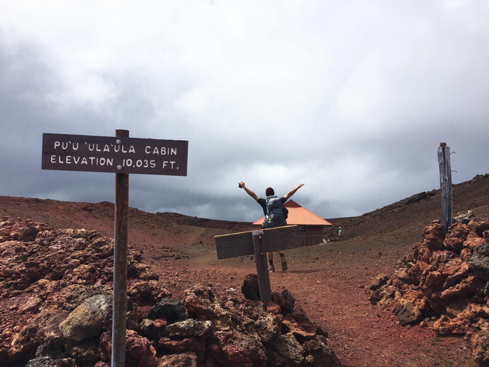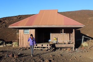 1. Hiker at Red Hill Cabin, 10,035 feet elevation, Mauna Loa Volcano (National Park Service [*]). 2-4. Sign for Red Hill Cabin, 10,035 feet; above the clouds view nearby; and interior view of cabin (Adventure Tours Hawaii [*]. Kilauea lava fountain, April 1, 2025.